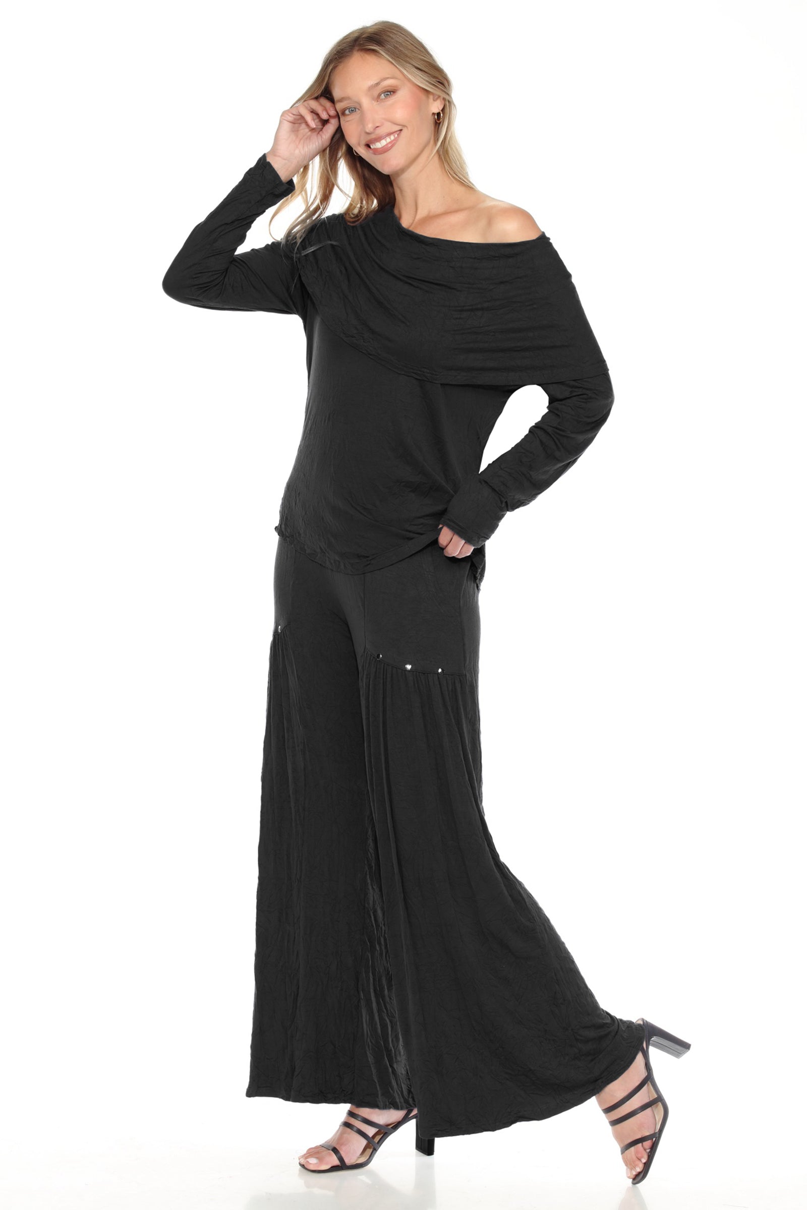 The Mila Top features a convertible draped neckline that can be styled three ways: off the shoulder for evening allure, as a cowl for daytime polish, or wrapped for cozy coverage. The Paris Pant completes the look with a graceful wide-leg silhouette, elastic waistband, and roomy patch pockets with rivet detail—refined touches that balance style and ease.