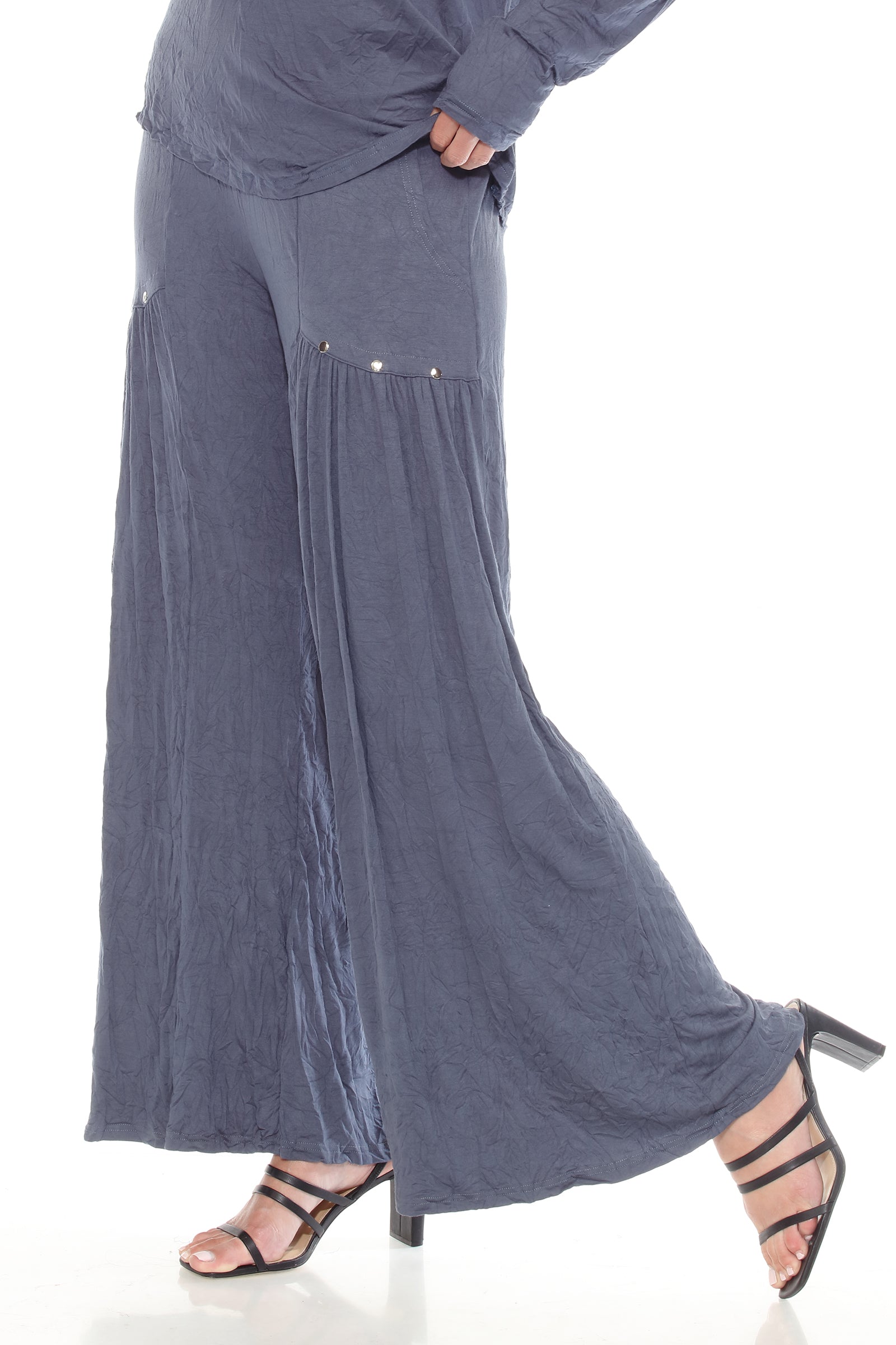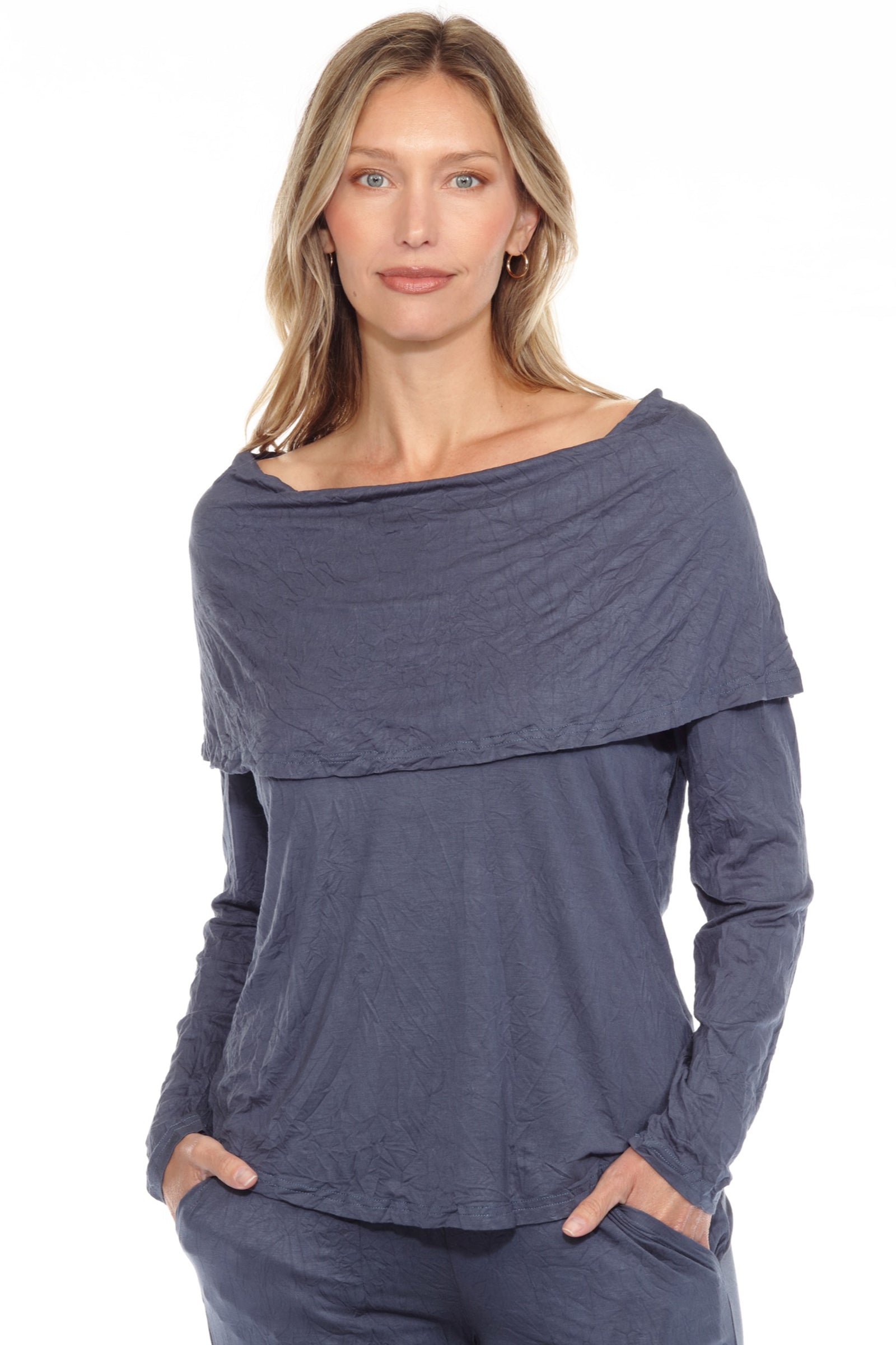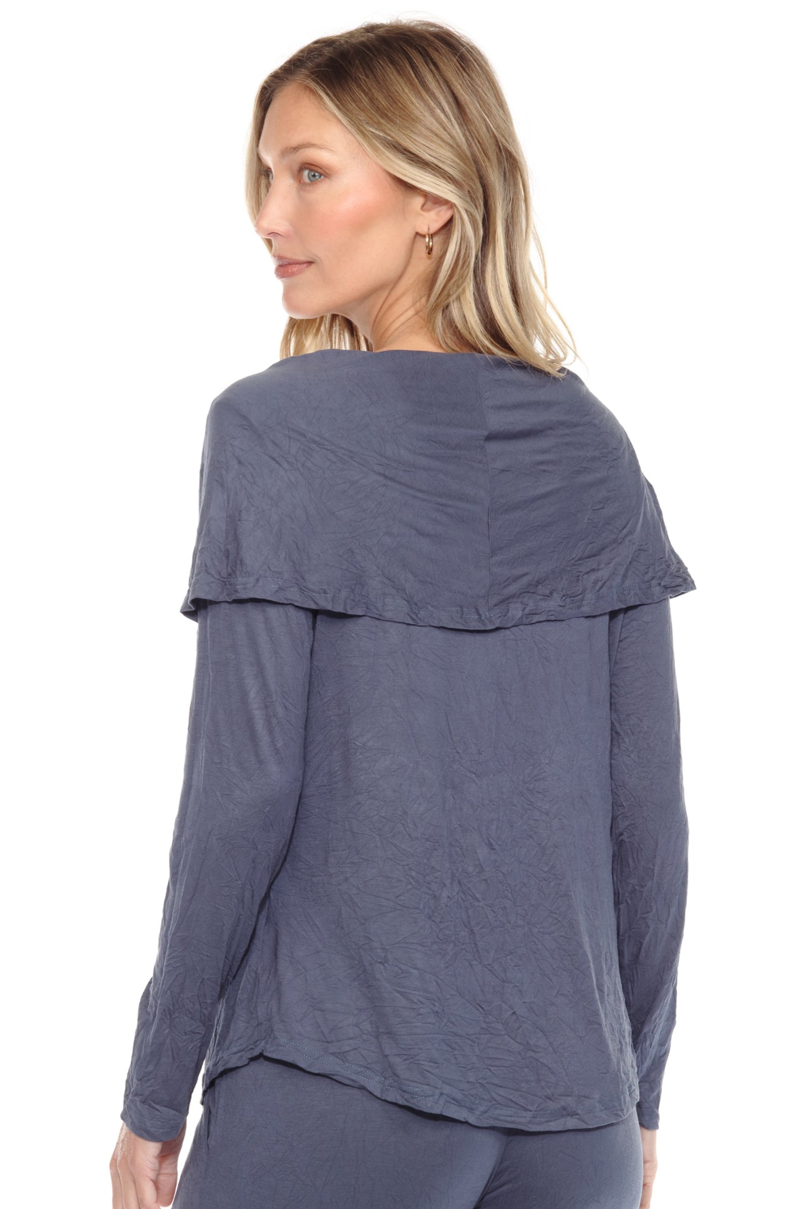 The Mila Top features a convertible draped neckline that can be styled three ways: off the shoulder for evening allure, as a cowl for daytime polish, or wrapped for cozy coverage. The Paris Pant completes the look with a graceful wide-leg silhouette, elastic waistband, and roomy patch pockets with rivet detail—refined touches that balance style and ease.