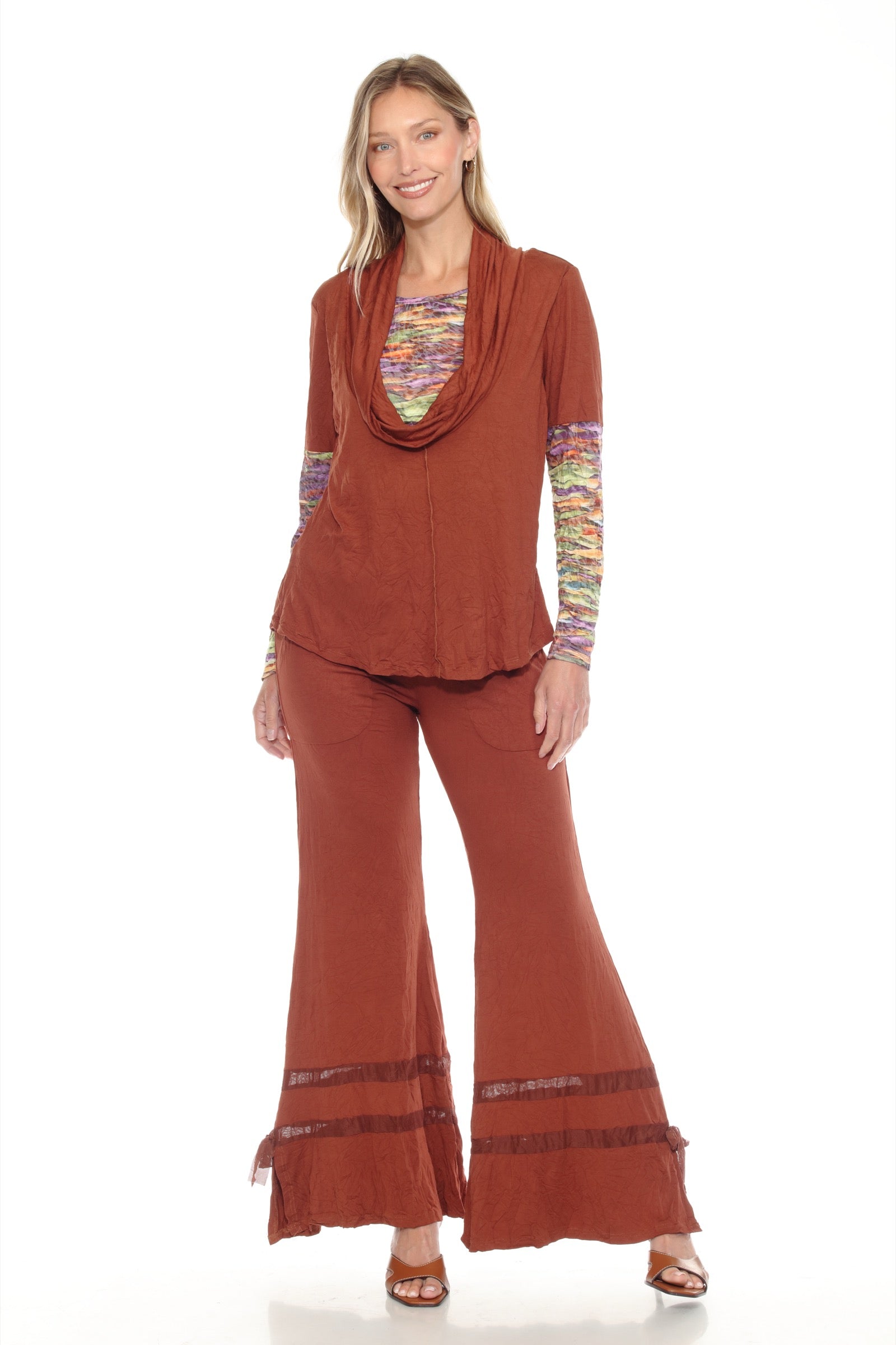 The Peyton Top features a softly draped cowl neckline with contrast inset and printed long sleeves in the Sunset Ribbons motif—streaks of coral, violet, green, and gold reminiscent of a glowing horizon at dusk. The Flare Pant complements perfectly with a fluid fit-and-flare silhouette, elastic waistband, roomy patch pockets, and mesh-inset hem for graceful movement.